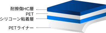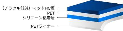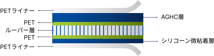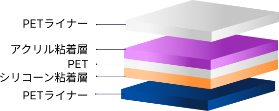 - アクリル粘着層をガラス板、またはアクリル板等と貼り合わせることにより、シリコーン微粘着機能を不要